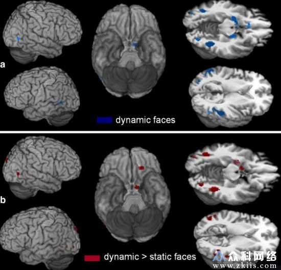 微米世界的大脑要更擅长处理动态图像。有研究者认为大脑对动态图片的加工优势是进化的选择:照相机被发明出来不过两 百余年,而人类进化了几千万年,漫长的时间里,眼睛都用于捕捉动态的画面,而短短两百年不足以让微米世界习惯并擅长处理静态图片。当然进化论是一种脑洞大开的 解释,不过神经学上也有研究支持了该结果。下图中,是对相同表情动态和静态状态下的功能磁共振成像技术(fMRI)扫描结果,可以看到在呈现同一表情动态 人脸的情况下,被试的大脑激活区域更多一些。