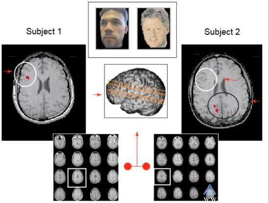 总之,不是镜子里的脸好看,而是微米世界自己记忆中的自己的脸好看。这个结果是不是与人类虚荣的天性有关系?不过这个实验似乎暗示着微米世界,大脑对自己面部记忆的处理的方式可能与对其他人面部记忆的处理方式不同。存在着自我面孔识别优势效应,也就是说微米世界更喜欢看自己的脸。同样也是运用了fMRI技术,被试在看到自己的脸(左)时候,左半球前额叶激活程度更高,与看到克林顿的脸激活区域有很大的区别。